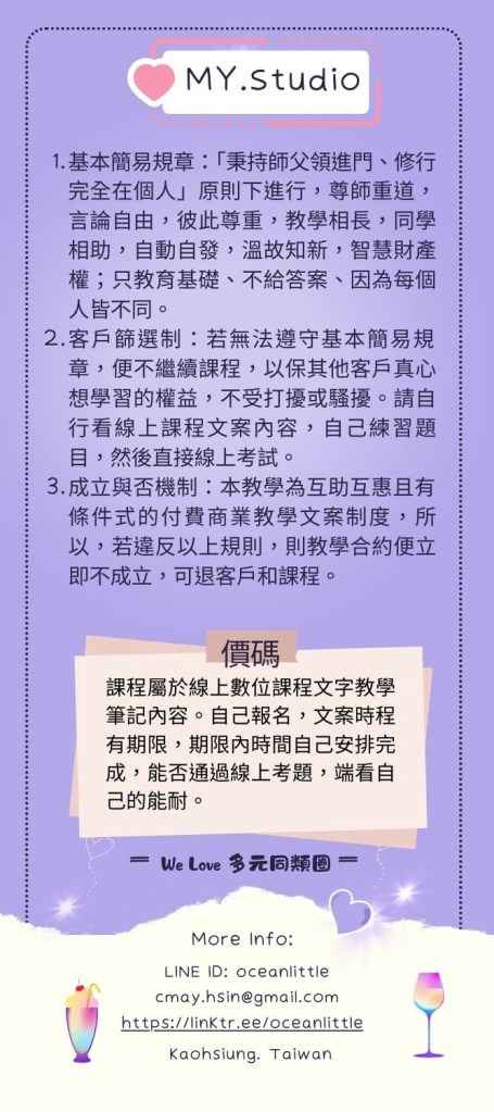 最近在想線上商業教案的事情,思考一陣子,覺得,還是以線上文案課程筆記內容為主製作,比較合適我的性格和風格,也不用常被奧客打擾甚煩。