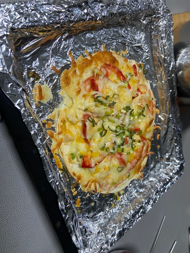 我自己用奶油搭配一些辛香料來煎小干貝,當作今天小pizza的主角,用了兩個墨西哥餅皮,第一層抹上淡淡一層的無糖優格和碎青蔥,然後上面一層的墨西哥餅皮就鋪上要吃的佐料和起司條囉!